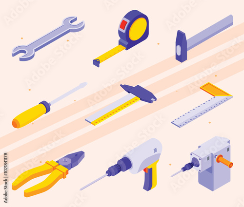 Isometric icons showing repair work tools and equipment.