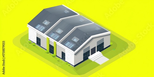 Isometric illustration of a building with multiple sections on a green lawn