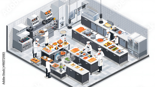 Isometric illustration of a busy restaurant kitchen with chefs preparing food