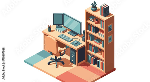 Isometric illustration of a home office workspace with computer and bookshelf.