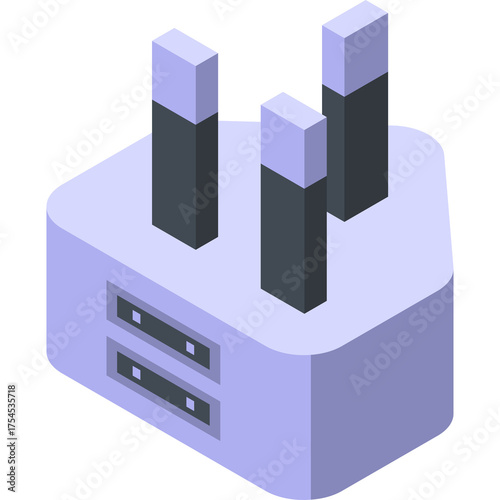 Isometric Illustration of a Power Plug Adapter with Three Prongs and Two USB Ports in a Light Purple and Dark Gray Color Scheme on a Transparent Background