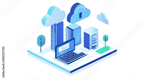 Isometric Illustration of Secure Cloud Computing with Laptop and Buildings