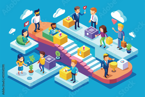 Isometric illustration shows people interacting in complex online network, highlighting dynamic connections, Followers Customizable Isometric Illustration