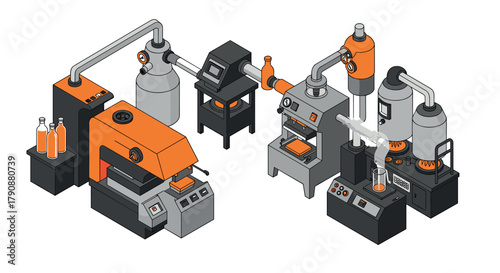 Isometric industrial bottling and packaging factory equipment with orange accents