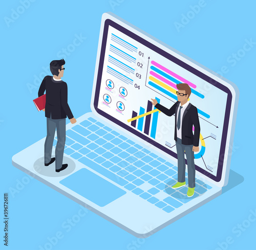 Isometric laptop with charts, diagram, infochart at screen. 3d growing graphic. Teamwork analysis. Worker showing presentation of financial plan, strategy. Man with folder looking at screen of laptop