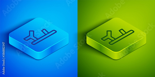 Isometric line Baby shoes icon isolated on blue and green background. Sandal sign. Square button. Vector.