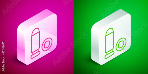 Isometric line Bullet icon isolated on pink and green background. Silver square button. Vector