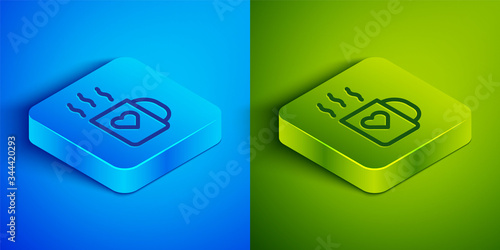 Isometric line Coffee cup and heart icon isolated on blue and green background. Couple coffee for lovers on Valentines Day. Square button. Vector Illustration