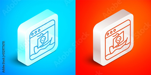 Isometric line Internet piracy icon isolated on blue and red background. Online piracy. Cyberspace crime with file download and movies sharing. Silver square button. Vector