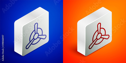 Isometric line Plane propeller icon isolated on blue and orange background. Vintage aircraft propeller. Silver square button. Vector.