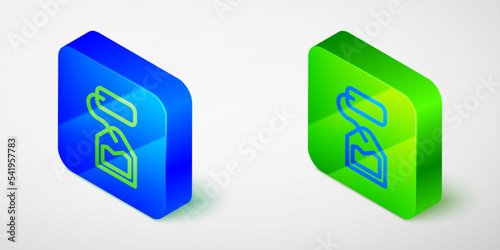 Isometric line Tea bag icon isolated on grey background. Blue and green square button. Vector