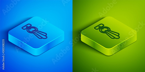 Isometric line Towel on a hanger icon isolated on blue and green background. Bathroom towel icon. Square button. Vector.