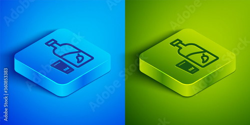 Isometric line Vodka with pepper and glass icon isolated on blue and green background. Ukrainian national alcohol. Square button. Vector Illustration