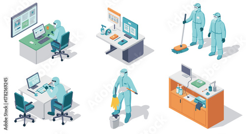 Isometric office and cleaning worker scenes modern workplace and hygiene solutions