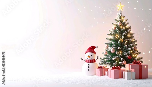 Isometric Pastel Christmas Scene with Tree, Gifts, Snowman, and Falling Snow on White Background