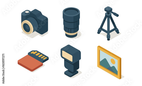 Isometric photography equipment set: camera, lens, tripod, flash, memory card, frame