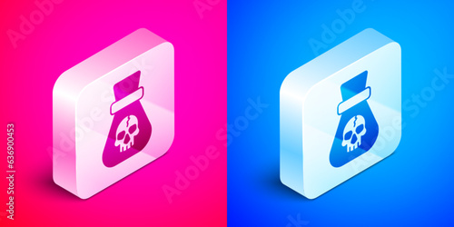 Isometric Pirate coin icon isolated on pink and blue background. Silver square button. Vector