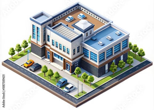 Isometric Police Station Architectural Marvel with Intricate Detailing on White Background