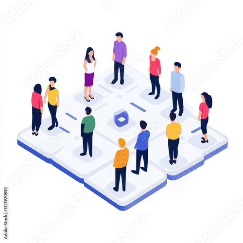 Isometric professional team standing on a digital grid, symbolizing corporate networking and strategy planning.