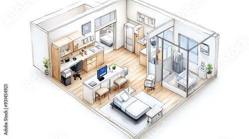 Isometric Sketch of a Modern Studio Apartment Interior Design.