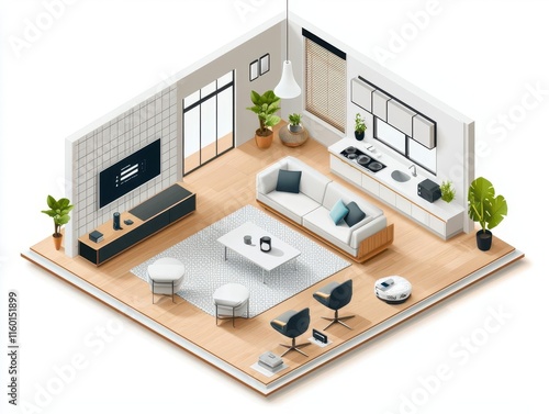 Isometric smart apartment with automated window shades and energysaving smart systems