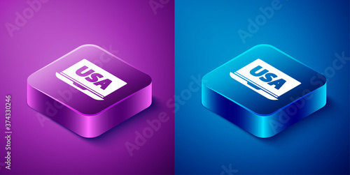Isometric USA United states of america on laptop icon isolated on blue and purple background. Square button. Vector.