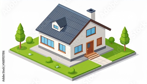Isometric vector illustration of a modern suburban house on a green lawn, representing real estate investment and family home ownership