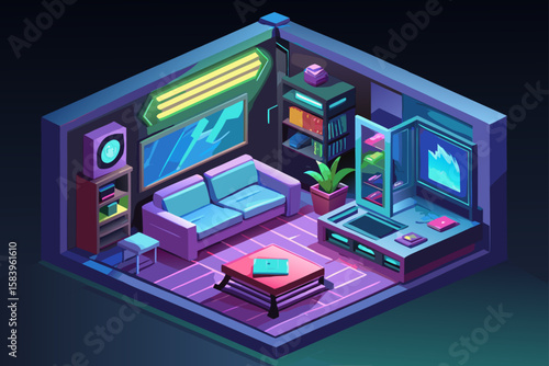 Isometric Vector of a Futuristic Living Room with a Holographic TV