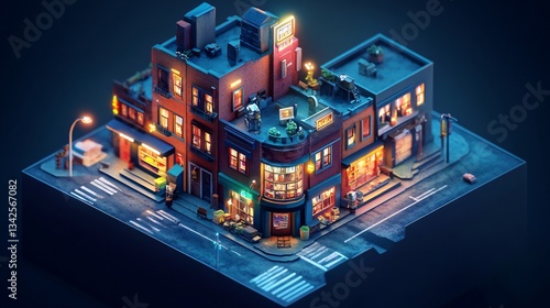 Isometric view of a detailed cityscape with illuminated buildings, street elements, and intricate urban design. A miniature world captured in pixelated perfection.