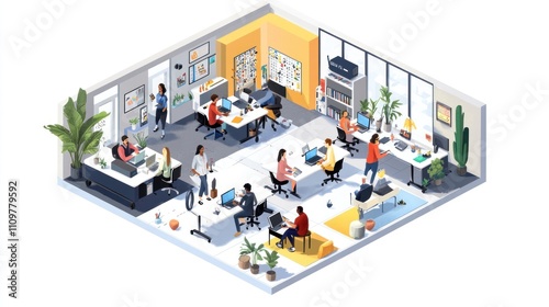 Isometric view of a modern, diverse office space with employees working at desks and collaborating.