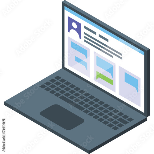Isometric View of a Modern Laptop Displaying a User Profile Page with Social Media Feeds on a White Background