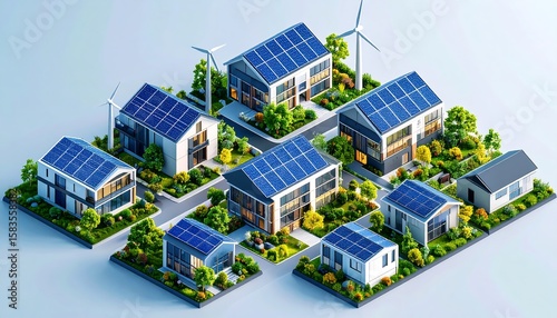 Isometric view of a sustainable neighborhood with solar panels and wind turbines