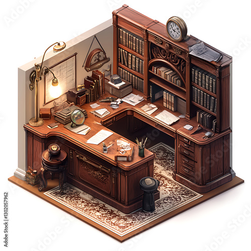 Isometric View of a Vintage Wooden Office with Bookshelves and Desk