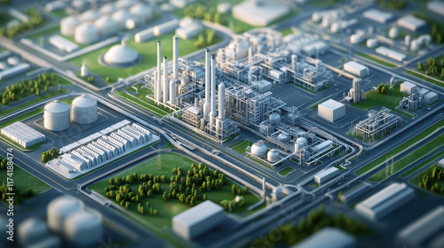 Isometric view of an industrial city with a chemical plant, 3D rendering