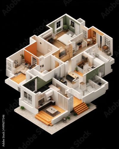 Isometric view of modern apartment floor plan with furniture and decor, 3D rendering, architectural visualization, residential building