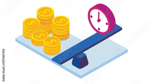 Isometric view of stacked coins and a clock on a balance scale representing time versus money concept