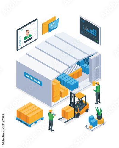 Isometric warehouse illustration showing logistics management with forklift, workers, boxes, pallet, and IoT system.