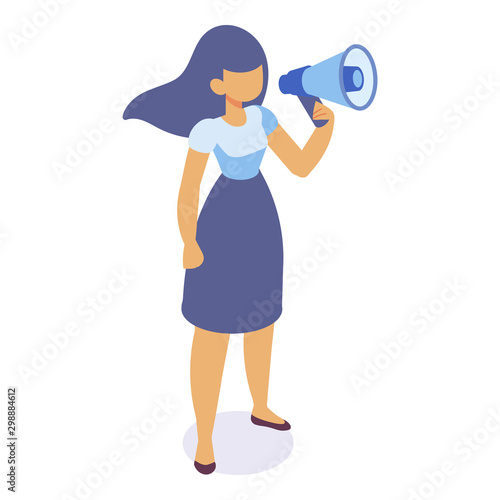 Isometric woman in skirt with loudspeaker. Vector isolated character.