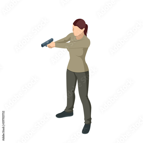 Isometric woman with a gun in his hand iolated on white. Male policeman, spy or criminal holding. Front view