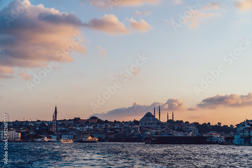 Istanbul old city with Galata promenade from ferry boat. View from Bosphorus water, cityscape with Mosque pics