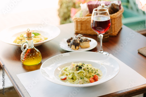 Italian food - fettuccine pasta and pesto sauce with seafood.
