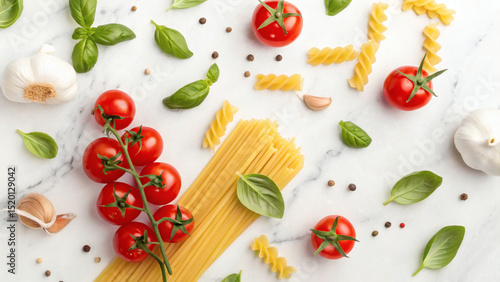 Italian Food Ingredients on White Marble with Copy Space