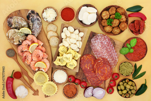 Italian healthy food for a balanced diet high in antioxidants, fibre, lycopene, omega 3 & protein. With meat, seafood, cheese, vegetables, pasta, sauces & herbs. Health food concept on mottled yellow.