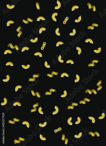 Italian pasta - Cornetti on a black background. Creative culinary background for restaurant, menu, poster, advertisement.