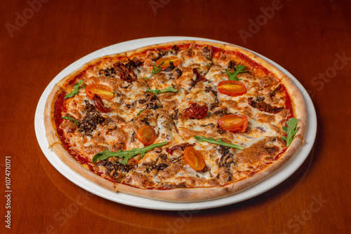 Italian pizza with cherry tomatoes, meat and cheese on a plate on a wooden background