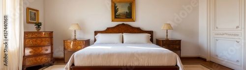 Italian Renaissance-style bedroom with antique furniture, classical art, and rich European elegance