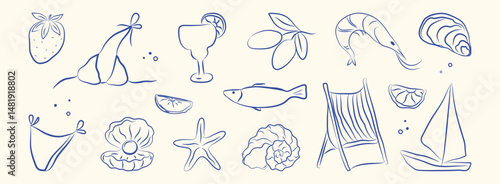 Italian summer set. Hand drawn doodle greek seafood, coast sea elements for placard, Italy menu, poster. Coastal Greece foods, oyster, olive, lemon, shell, shrimps, fish, bikini. Vector illustration.