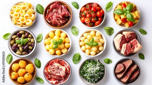 Italian traditional food dishes set, top view. Gnocchi, polenta, carbonara, arancini, ossobuco, bistecca alla fiorentina, steak, ribollita, parmigiana, caprese salad, pasta.