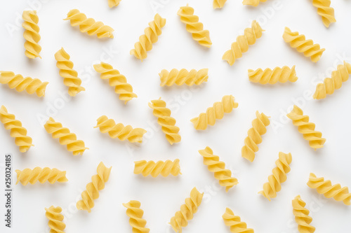 Italian twisted pasta fusilli isolated on white background. Fusilloni, rotini.