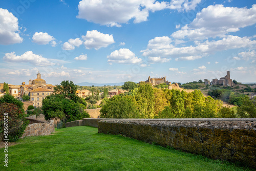 Italy, Lazio, Tuscania, Stone wall surrounding public park in historic town